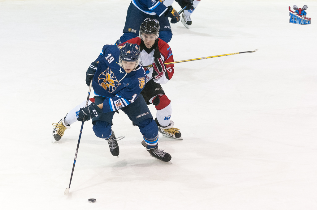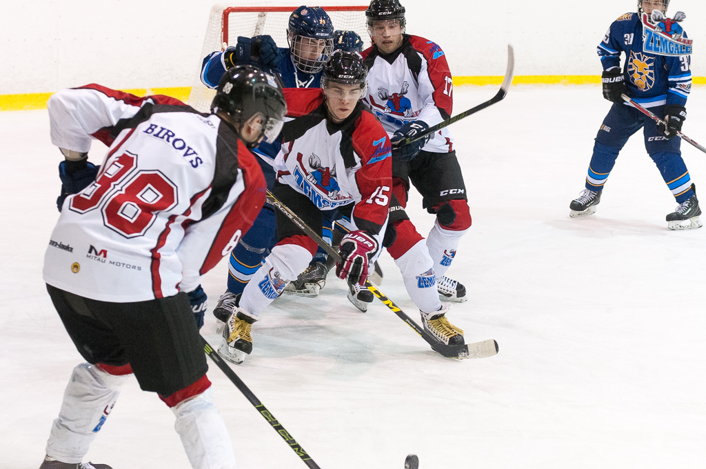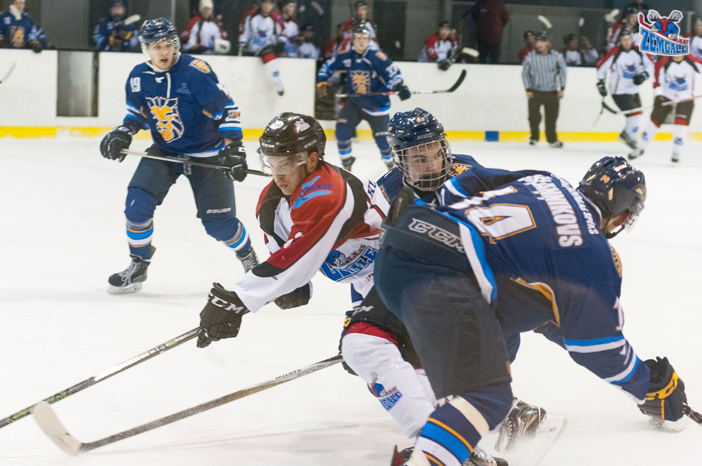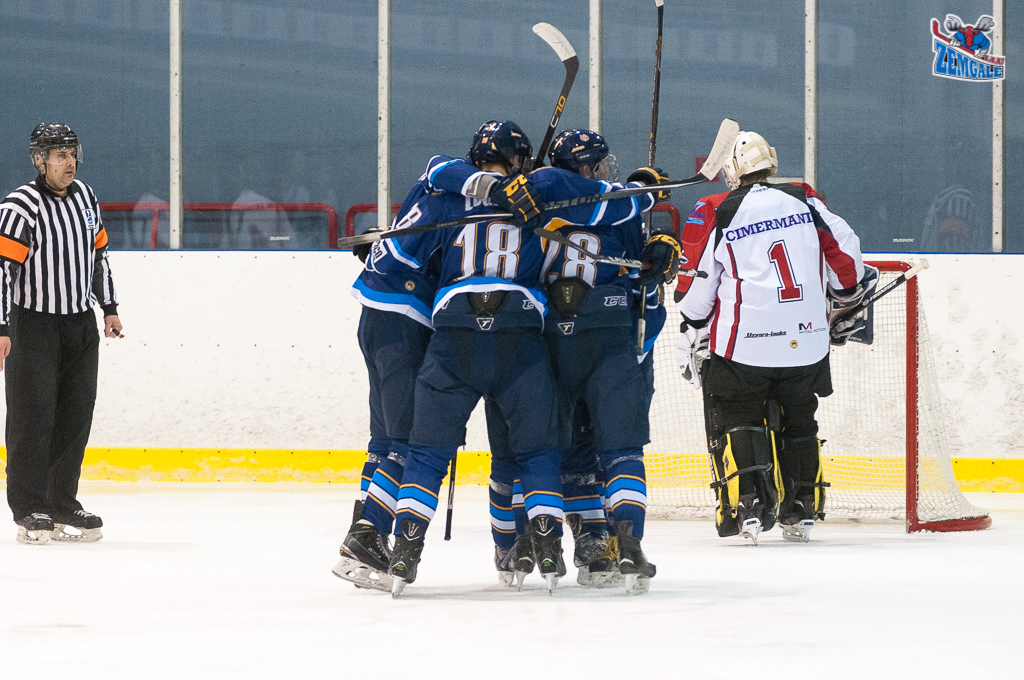 Pirmās spēles minūtēs abas komandas aizvadīja diezgan pasīvi. HK “Zemgale/LLU” bija pārsvars ripas kontrolē, bet viņa to neizmantoja un gausi saspēlējās pretinieku aizsardzības zonā. HS “Rīga” nenācās īpaši aizsargāties un septītā minūtē viņi devās veiksmīgā pretuzbrukumā. Precīzu metienu veica Elvis Dins Kalnbērziņš un par pārsteigumu jelgavniekiem atklāja spēles rezultātu – 1:0. Jelgavnieki bija apstulbuši tik tālu, ka pēc sešpadsmit sekundēm izlaida Ņikitas Jengašova uzbrukumu caur labo malu, kas noslēdzās ar gūtiem vārtiem – 2:0. HK “Zemgale/LLU” neticot graujošam rezultātam, uzsāka kustēties ātrāk un pēc pusotra minūtes spēja vienu vārtus atgūt. Uzbrukuma smailē izcēlās aizsargs Rinalds Rosinskis, kurš spēja aizkļūt līdz vārtiem un izdarīt metienu. Atlēkušo ripu kritienā vārtos ieraidīja Raivis Kurnigins – 2:1. Jelgavniekiem bija dota iespēja spēlēt vairākumā un izlīdzināt spēles rezultātu, bet viņi šo iespēja palaida garām. Toties HS “Rīga” spēlētāji nesnauda un septiņpadsmitā minūtē ripu starp Riharda Cimermaņa kājsargiem ieraidīja Emīls Potapovs – 3:1. HK “Zemgale/LLU” spēles temps pieauga, bet to piebremzēja nopelnītais noraidījums. Spēlējot mazākumā pretuzbrukumā devās jelgavnieku uzbrucējs Artjoms Ogorodņikovs. No pirmā piegājiena vārtus gūt neizdevās, bet kopā ar Romānu Ņekļudovu izdevās ripu zonā noturēt un beigās Artjoms viņu arī ieraidīja vārtos – 3:2.