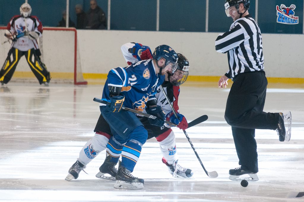 Pirmo trešdaļu HK “Zemgale/LLU” aizvadīja pārliecinošā vadībā, ļaujot pretiniekam tikai dažas reizes ieiet un nostāties savā aizsardzības zonā. Pārējo laiku jelgavnieki pārliecinoši kontrolēja ripu un veidoja bīstamus uzbrukumus. Toties šajā spēlē neizdevās lauzt jau ierasto praksi, ka neskatoties uz spēles gaitas kontroli, HK “Zemgale/LLU” spēlētāji spēj izlaist pretinieka vienīgo izgājienu, kurā tas gūst vārtus. Šoreiz HS “Rīga” to paveica septītā minūtē. Aizsargs Andrejs Kostjuks ne līdz galam nobloķēja uzbrucēju Artojomu Pankeviču un tas brīvi no aizvārtes uz vārtu priekšu atdeva piespēli Vladislavam Koniševam, kurš ieraidīja ripu HK “Zemgale/LLU” vārtos – 1:0. It kā nevainīgs uzbrukums, pārvērtās par viegli zaudētiem vārtiem, padarot jelgavniekus par iedzinējiem spēlē. Viesu pārākums ripas kontrolē un pretinieka spēlētāja noraidījums, ļāva izlīdzināt spēles rezultātu jau pēc pusotra minūtes. Jelgavnieki uzvarēja iemetienu pretinieku zonā, ar ripu esošais Olafs Aploks tika piespiests pie borta, bet spēja atdot piespēli uz zonas vidusdaļu. Pirmais pie tās tiecās Matīss Gelažis, bet pretinieka aizsargs izsita ripu no viņa nūjas. Pirmais pie nekontrolētās ripas nokļuva uzbrucējs Laris Rancevs un atdeva to uz kreiso pusi, kur brīvs stāvēja komandas leģionārs Ivans Ribčiks (Ivan Rybchik). Nekavējoties sekoja metiens uz labo vārtu stūri, kur ripa izlidoja zem vārtsarga Riharda Norvaiša kreisās rokas un ielidoja vārtos – 1:1.