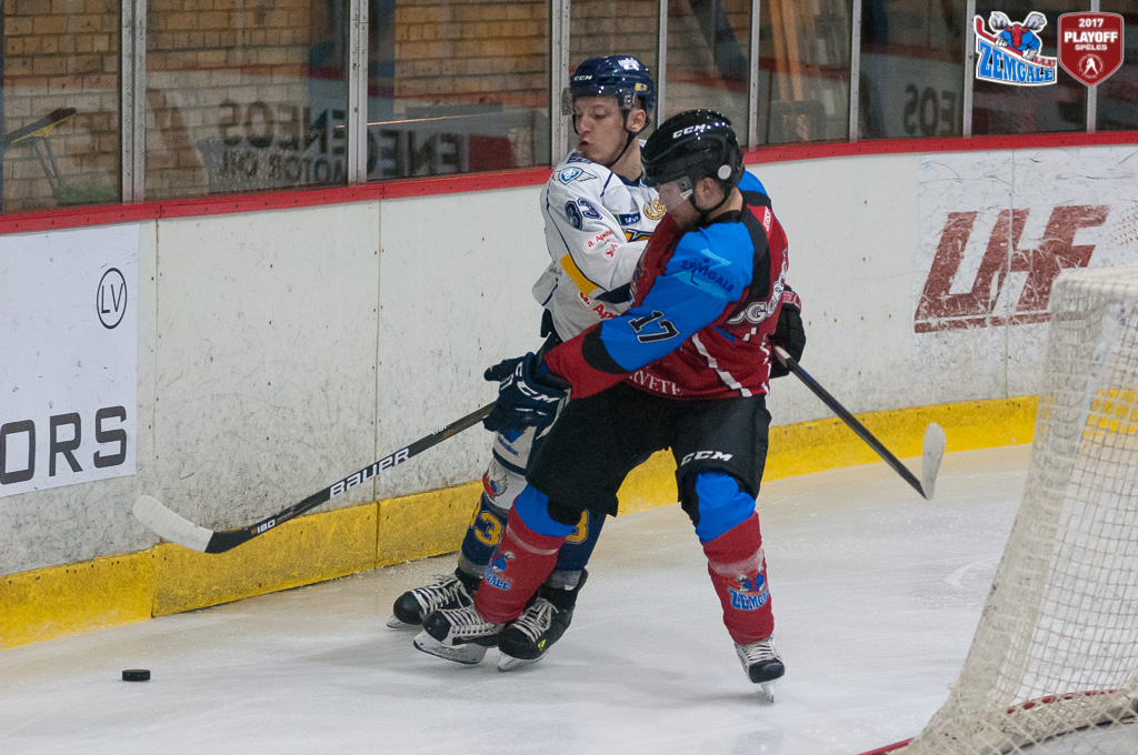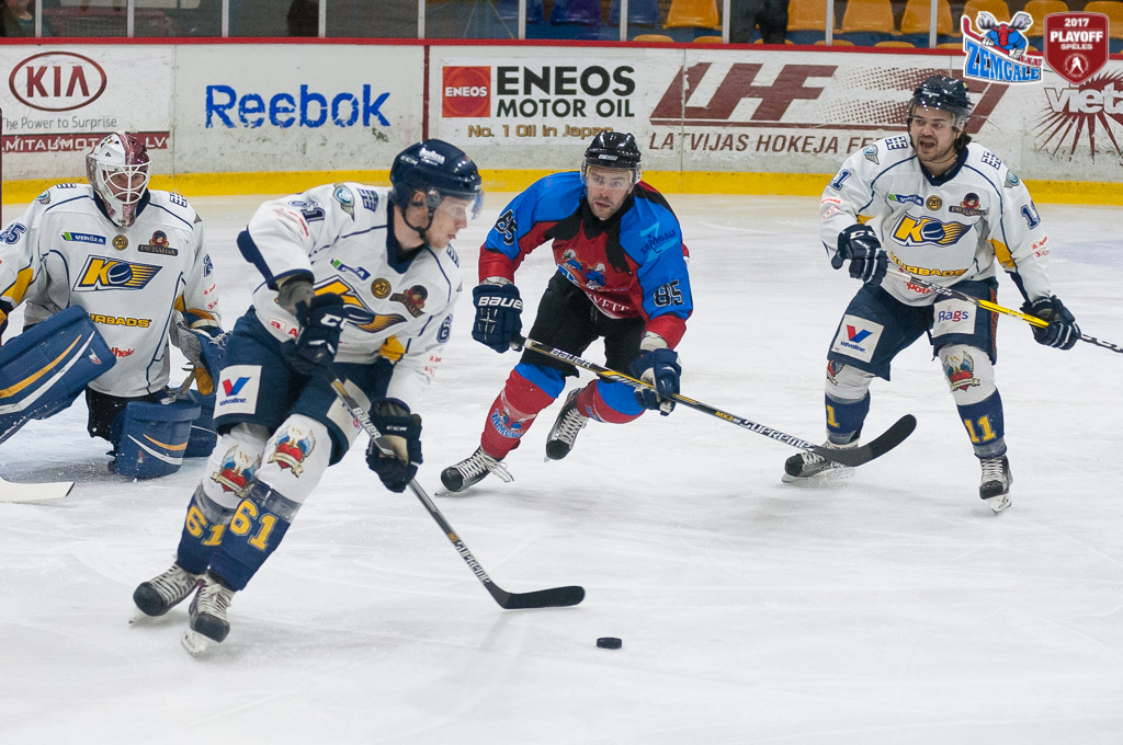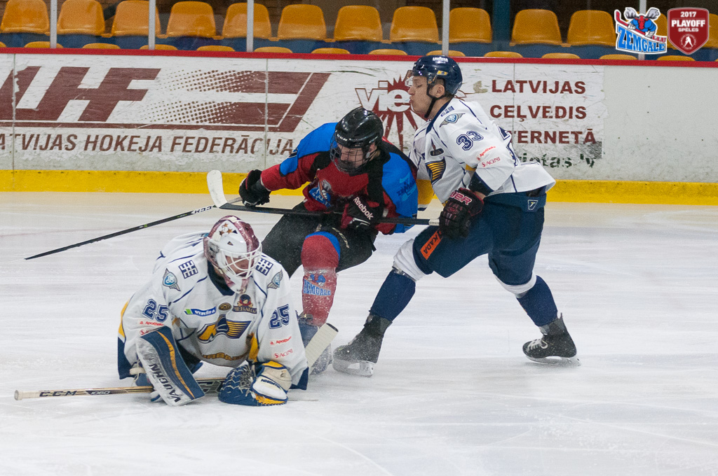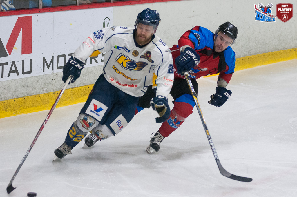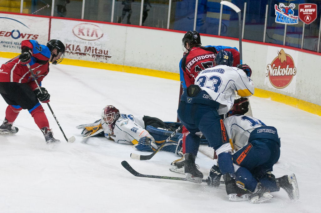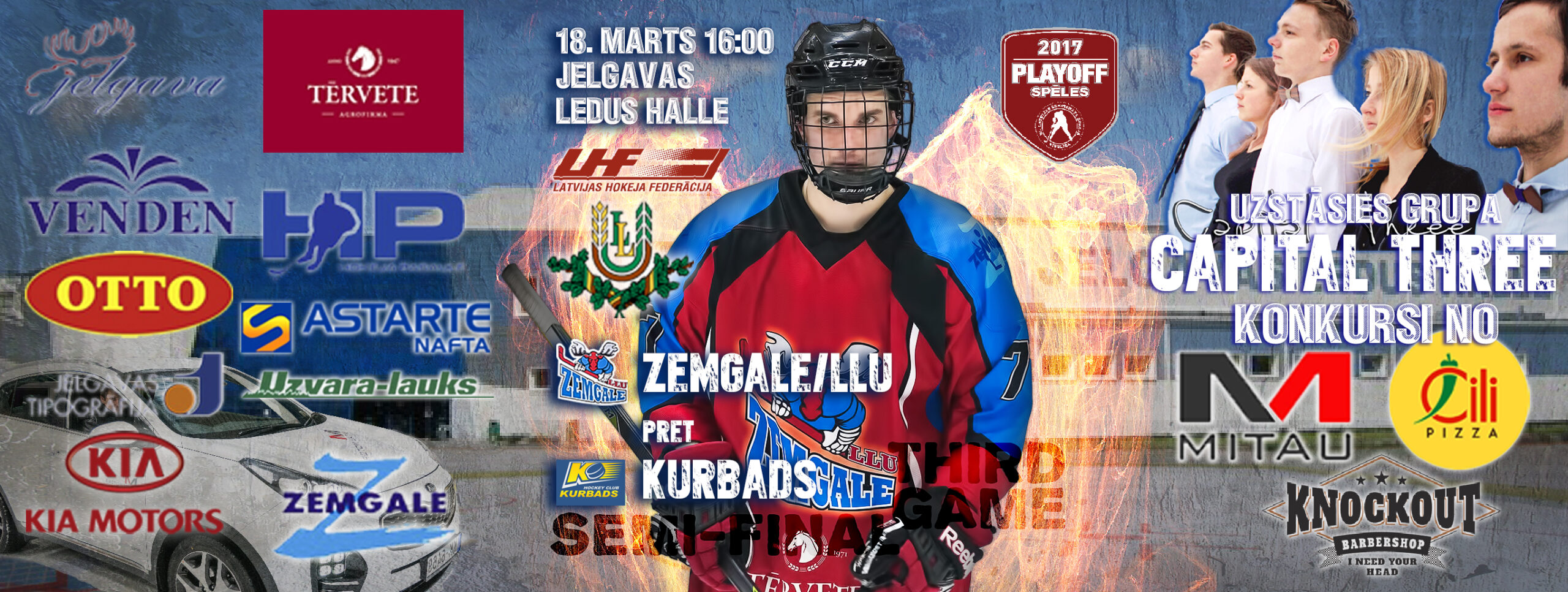 Latvijas hokeja Virslīgas pusfināla izslēgšanas sērija trešā spēlē savās mājās HK “Zemgale/LLU” tikās ar HK “Kurbads”. Jelgavnieku pārsteidzoši neagresīva spēle ļāva viesiem gūt četrus vārtus un zaudēt tikai vienu – 1:4 (0:2; 0:2; 1:0). Sērijas vadību atkārtoti iegūst HK “Kurbads” spēlētāji, kuri svētdienas ceturtā spēlē būs vienā solī no nokļūšanas finālā – 2:1. HK “Zemgale/LLU” spēlētājiem arī būs pietiekama motivācija cīņai līdz pēdējam.